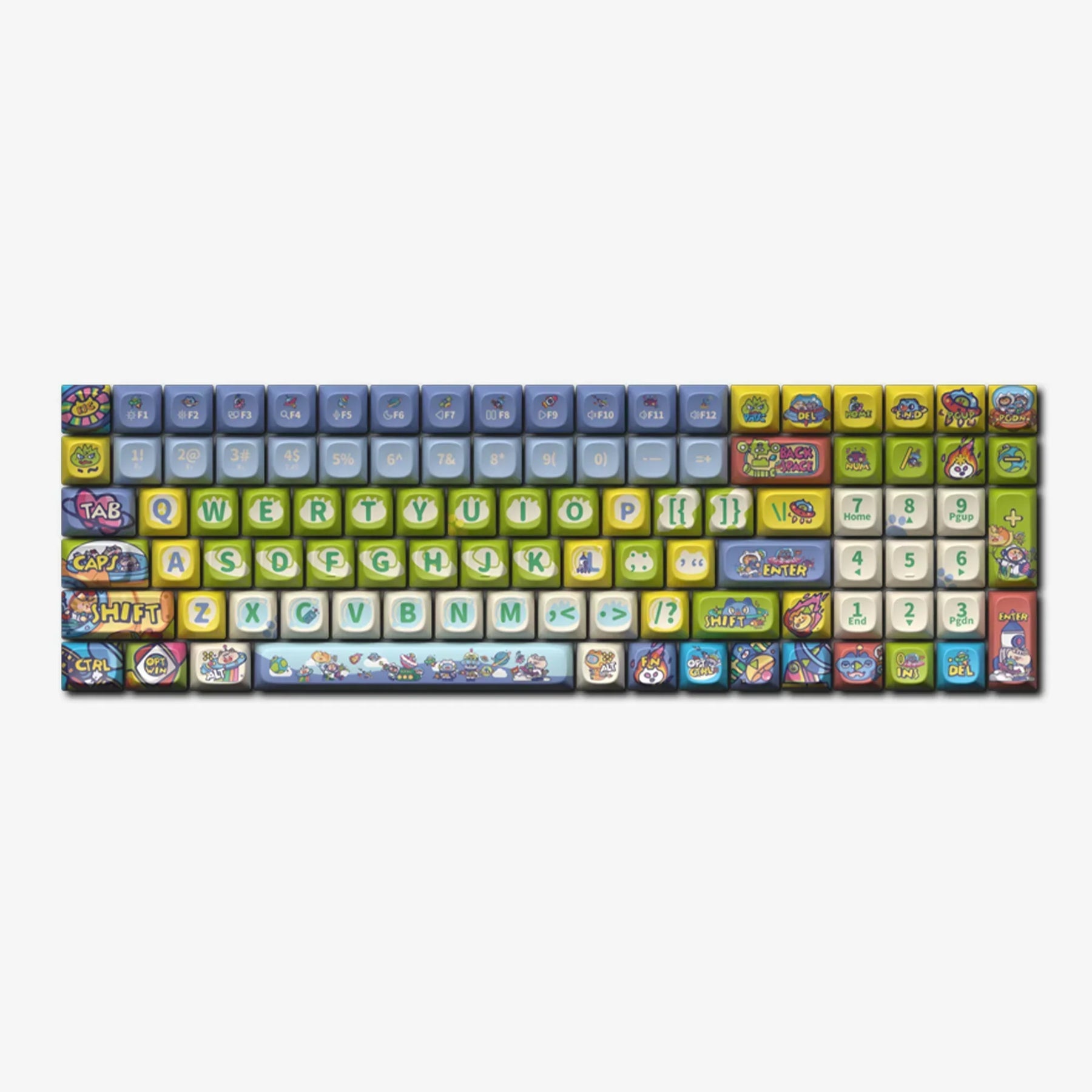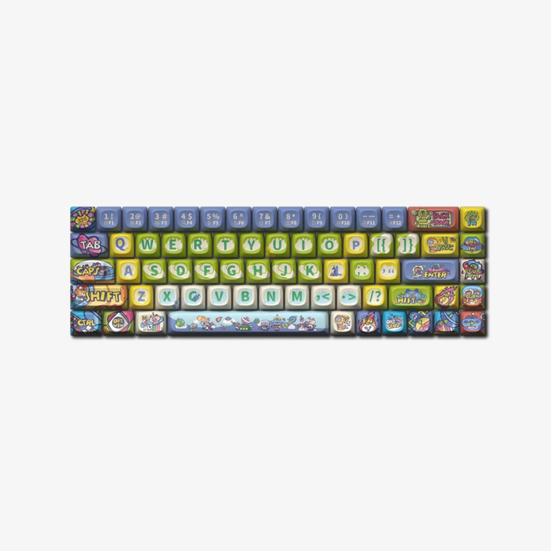 Embark on a cosmic adventure with our 'Cat Planet Adventure' keycaps, where space-faring cats patrol their territories aboard starships. Featuring pilot cats, scientist cats, and loyal green cats, this set tells the tales of epic 'Cat Star Wars' battles. The vibrant red, yellow, and green color scheme not only gives a high-tech feel but also adds liveliness and fun to your keyboard setup, inspiring every keystroke to be an interstellar journey.